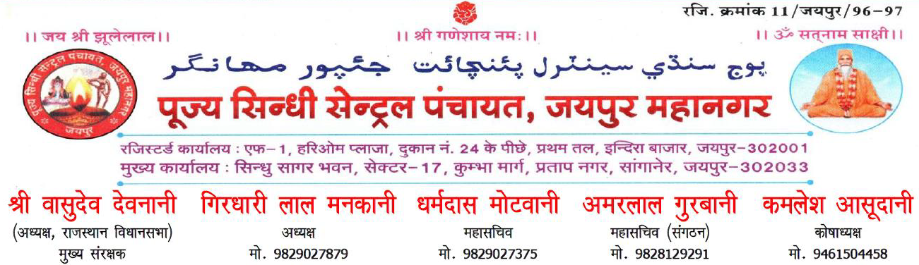 || पूज्य सिंधी सेंट्रल पंचायत जयपुर महानगर के अध्यक्ष के रूप में निर्वाचित होने पर हार्दिक धन्यवाद ||