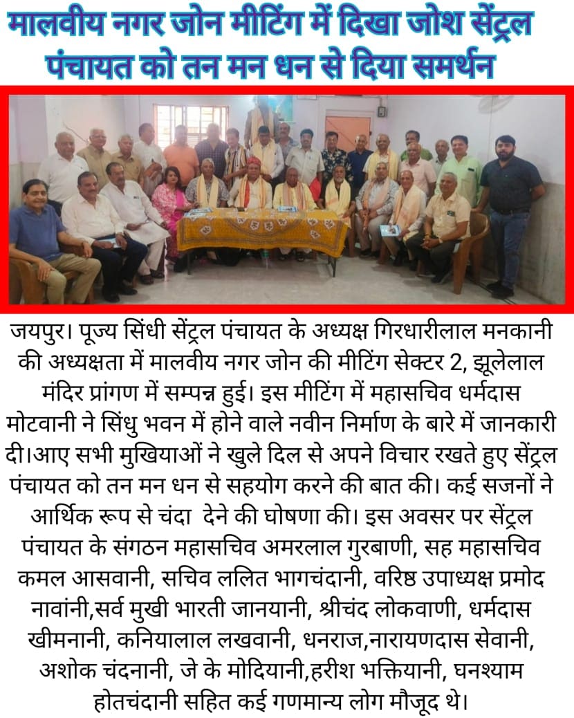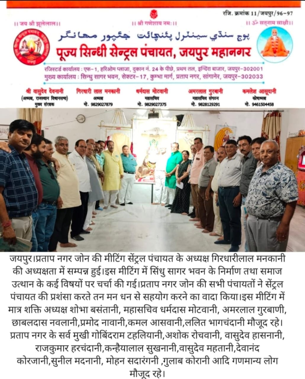 पूज्य सिंधी सेंट्रल पंचायत जयपुर महानगर के समस्त सदस्यों, समाज के गणमान्य व्यक्तियों, बुजुर्गों, माताओं और बहनों, और मेरे प्रिय भाइयों को हार्दिक धन्यवाद देना चाहता हूं। आपका आशीर्वाद, समर्थन और विश्वास मुझे इस पद पर पहुंचाने में सहायक रहा है। मैं अपने आप को सौभाग्यशाली मानता हूं कि मुझे समाज के विश्वास और समर्थन का पात्र माना गया है।
