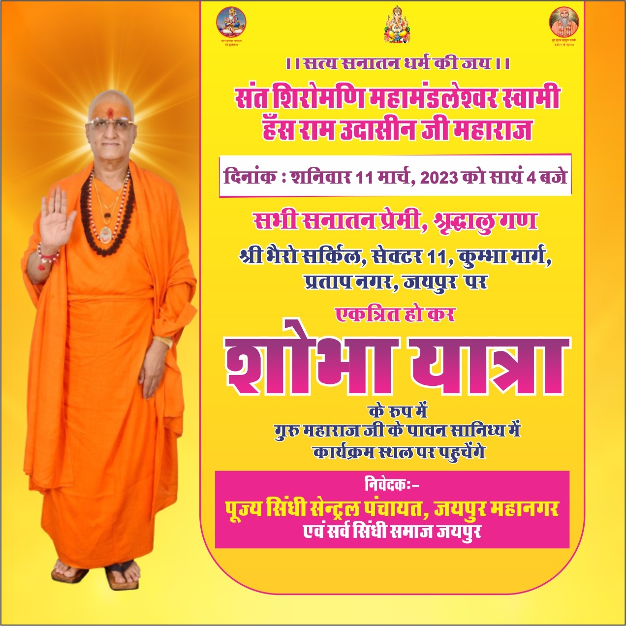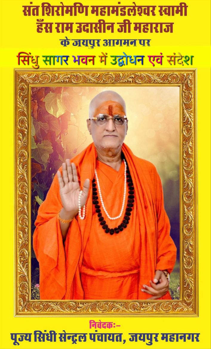 परम पूज्यनीय संत शिरोमणि महामण्डलेश्वर स्वामी हँसराम उदासी जी महाराज ने अपने आशीर्वचन में कहा कि पूज्य सिंधी सेंट्रल पंचायत,जयपुर महानगर द्वारा दरबार साहिब, भीलवाड़ा को आमंत्रण दिया गया है,सनातन धर्म के नाते,समाज के नाते,समाज में जन चेतना के वास्ते उक्त कार्यक्रम में अवश्य पधारेंगे ।हम सभी सिंधी मूल रुप से सनातनी है एवं अपनी मूल सनातनी संस्कृति को आगे बढ़ाते हुए ज्योत से ज्योत जगाकर विश्व में अपनी सिंधीयत क़ायम करेंगे ।
