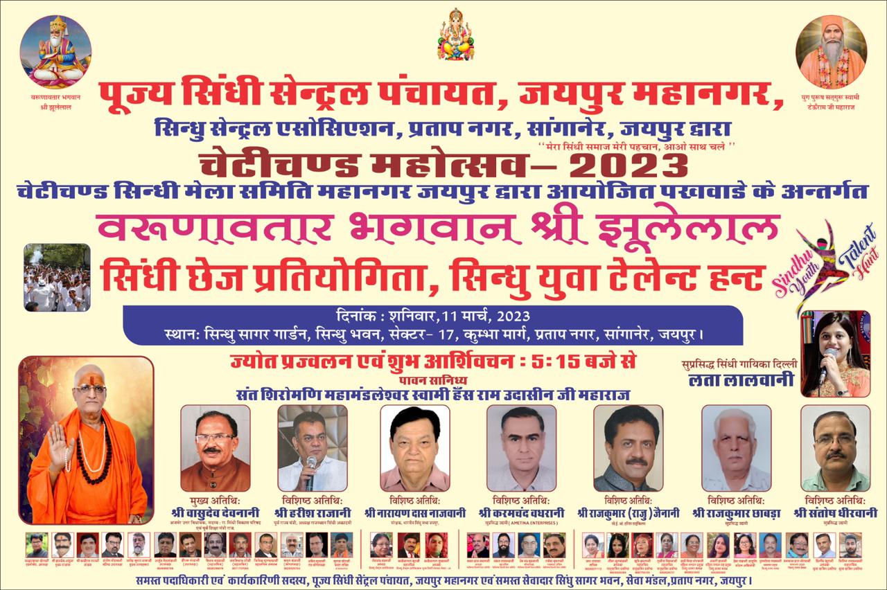 श्री चंद्र प्रकाश खेतानी जी एडवोकेट,अध्यक्ष,पूज्य सिंधी सेंट्रल पंचायत,जयपुर महानगर ने बतलाया कि पूज्यनीय संत शिरोमणी महामंडलेश्वर स्वामी हँस राम उदासी जी महाराज के पावन कर कमलों द्वारा दीप प्रज्वलन एवं आशीर्वचन से कार्यक्रम का शुभारंभ किया जायेगा ,संत शिरोमणि जी की उपस्थिति ऐतिहासिक होगी ।