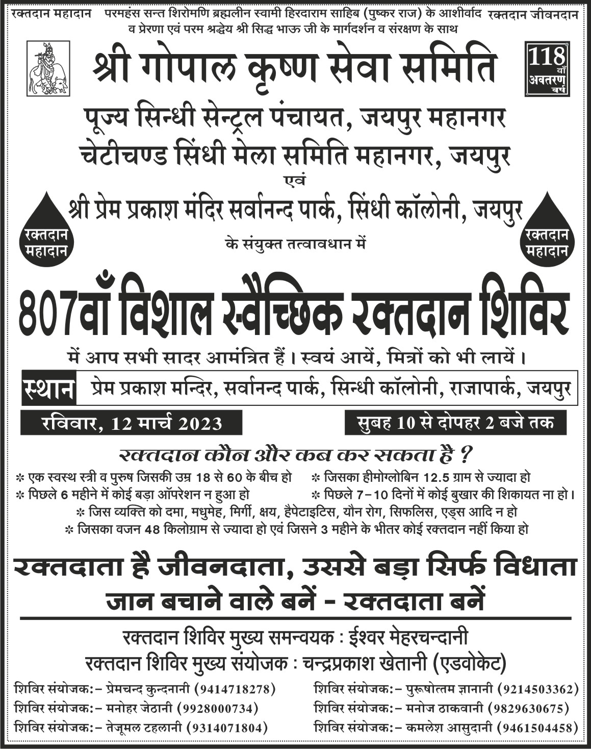 श्री गोपाल कृष्ण सेवा समिति, पूज्य सिंधी सेंट्रल पंचायत, जयपुर महानगर , चेटीचंड सिंधी मेला समिति, महानगर जयपुर एवं श्री प्रेम प्रकाश मंदिर, सर्वानन्द पार्क, सिंधी कॉलोनी, राजापार्क, जयपुर के संयुक्त तत्वावधान में विशाल स्वैच्छिक रक्तदान शिविर दिनाँक 12/03/2023 रविवार को प्रातःकाल 09 बजे से दोपहर 2 बजे तक